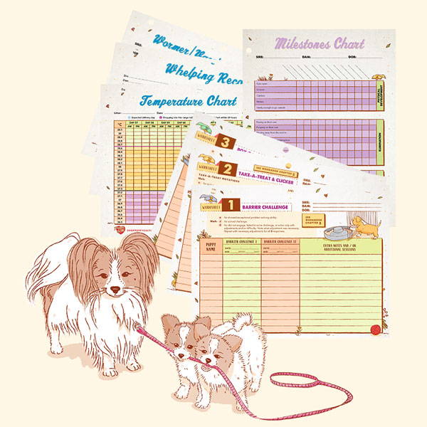 30 charts and worksheets for recording litter details, milestones and the Puppy Culture protocols, with scoring system